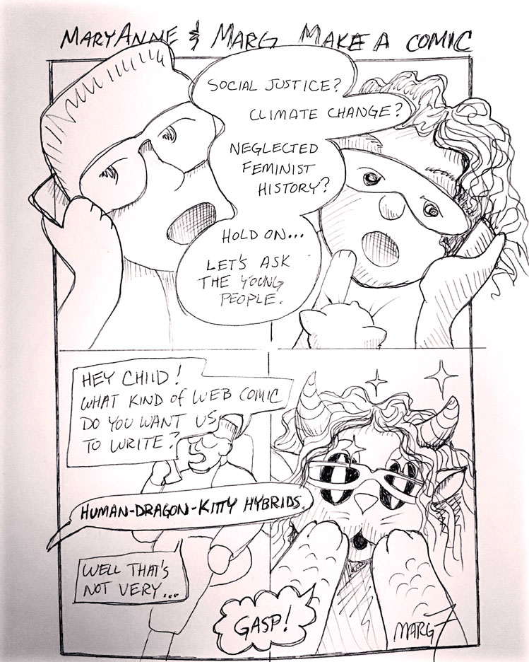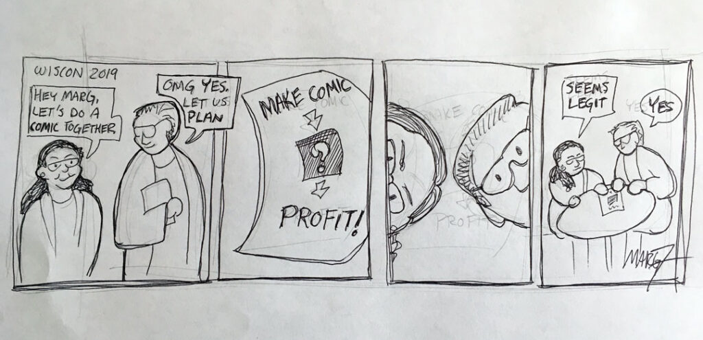 Assuming You Survive was co-conceived by Margaret Treanor Frey and Mary Anne Mohanraj after an inspiring writing convention in 2019. It’s written and illustrated by Margaret Treanor Frey.